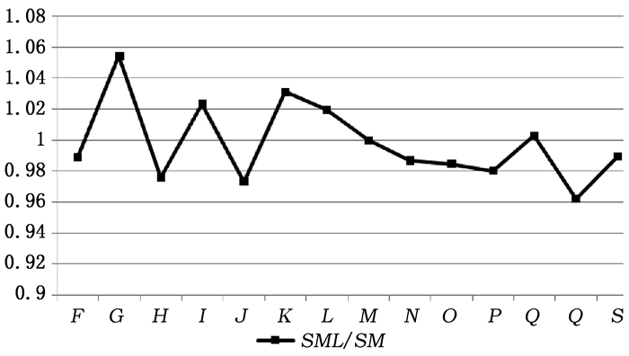 ①依据《国民经济行业分类》的标准,图中的代号依次为:交通运输、仓储和邮政业(F);信息传输、计算机服务和软件业(G);批发和零售业(H);住宿和餐饮业(I);金融业(J);房地产业(K);租赁和商务服务业(L);科学研究、技术服务和地质勘查业(M);水利、环境和公共设施管理业(N);居民服务和其他服务业(O);教育(P);卫生、社会保障和社会福利业(Q);文化、体育和娱乐业(R);公共管理和社会组织(S)。